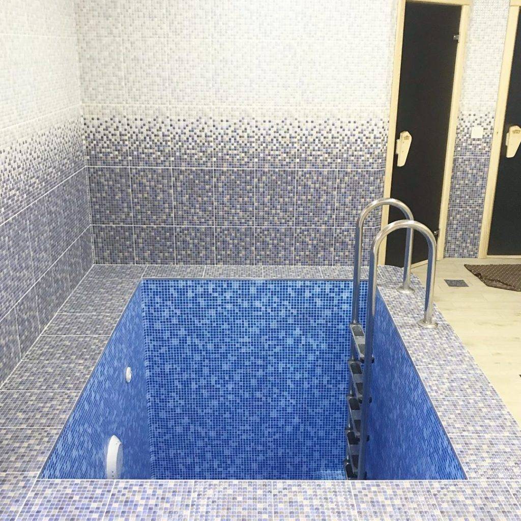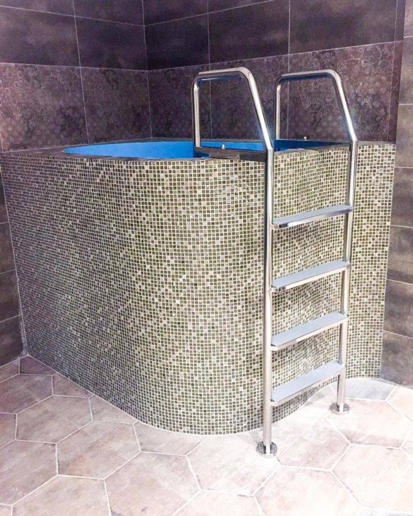 Купель, выложенную кирпичом под уровнем пола, хорошо украсить мозаикой в восточном стиле Купель, не занимающая пространства в помещении, оформляется плиткой и подсветкой