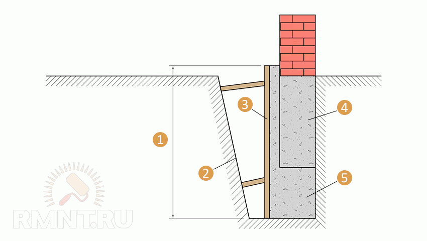 1 — высота купели; 2 — траншея; 3 — опалубка; 4 — существующий фундамент; 5 — наращиваемый фундамент