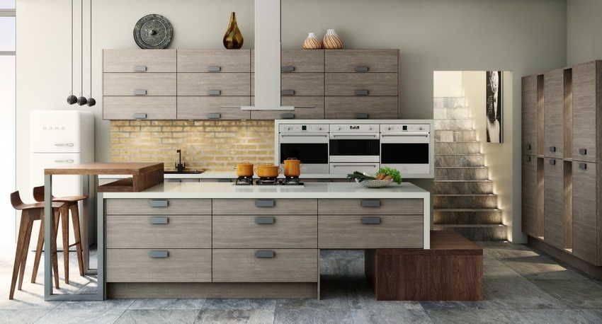 Наиболее универсальны однотонные поверхности, покрашенные в белый цвет. Холодные серые оттенки имитируют такие металлы, как титан или сталь. Их можно встретить в конструкциях кухонь стиля хай-тек.