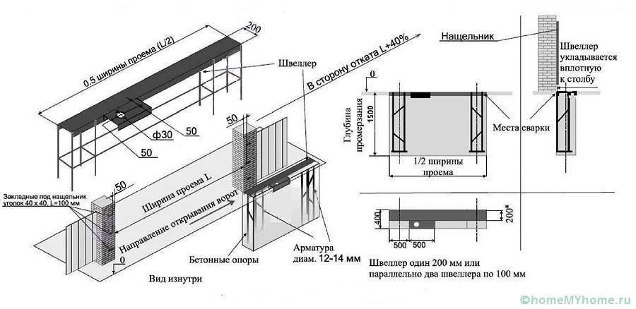 Следующий этап – подготовка котлована, его глубина обычно не превышает 2 м. Далее по ширине рва закладывают швеллер. К швеллеру приваривают арматуру диаметром 12 мм. Закладка элемента выполняется арматурой вниз, швеллер устанавливают по уровню, параллельно открытию ворот. Бетонные работы выполняют только после укладки закладного элемента.