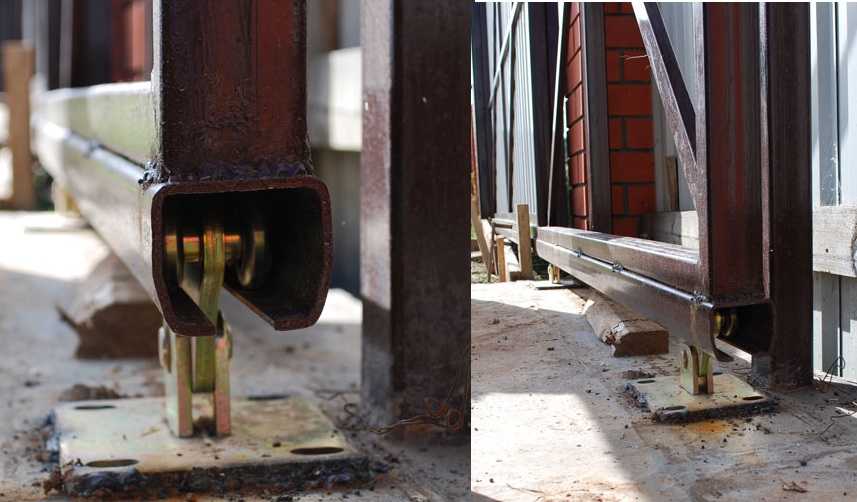 К закладному швеллеру привариваются шпильки, к ним потом на болтовых соединениях крепятся платформы с роликами. Иногда можно встретить варианты, когда платформы приварены сразу к закладной. Это неправильно. Существует довольно большая вероятность того, что фундамент или столб забора даст усадку. Даже небольшое смещение — и ваши ворота работать не будут. Если ролики со шпилек можно снять, шпильки переварить и все собрать на место, то как корректировать если платформа приварена? Срезать? Сложно, долго, без гарантий. Так что лучше в этом случае делать все по правилам.