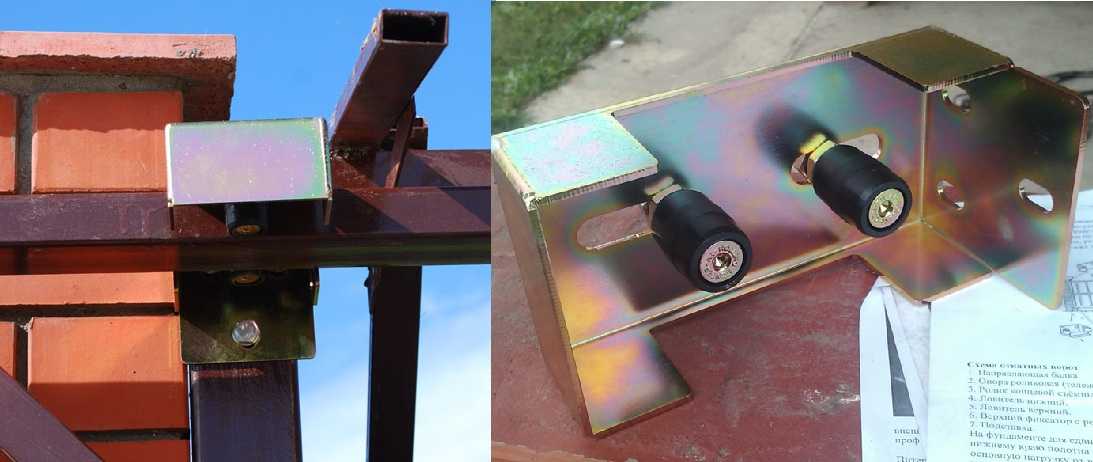 Теперь, чтобы ворота не «гуляли» в верхней части (они сейчас ничем не закреплены), к стойкам (80*60 мм) крепят комплекты верхних роликов — по одному на стойку. Их практически надевают на раму. Теперь имеющиеся внутри ролики будут придерживать ее вверху.