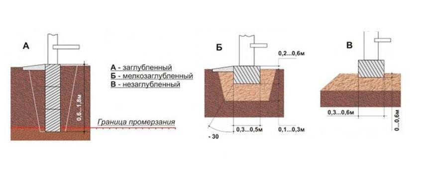 В зависимости от факторов различают заглубленный и мелкозаглубленный фундамент.