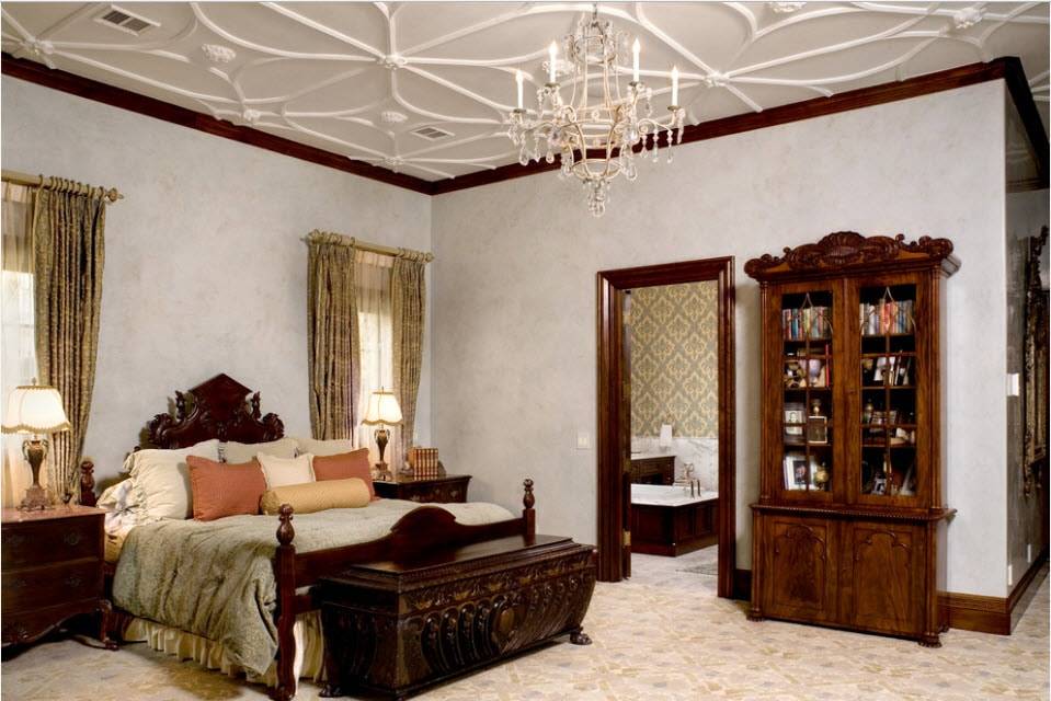 - Классический. Для такого стиля подойдет мебель из дерева, лучше ценной породы, например, дуба, орех, вишня. В качестве декора мебель отделывают резьбой или фурнитурой с блеском. Не лишним будут вензеля и витиеватость в мебели. Классический стиль любит текстиль, так что шторы, балдахин, бахрома. Для классики органично будут смотреться колонны в строгом, римском стиле, розетки для люстры, фрески с сюжетом тоже можно разместить на стенах. Или остановиться на чем-то одном, например, на панно.