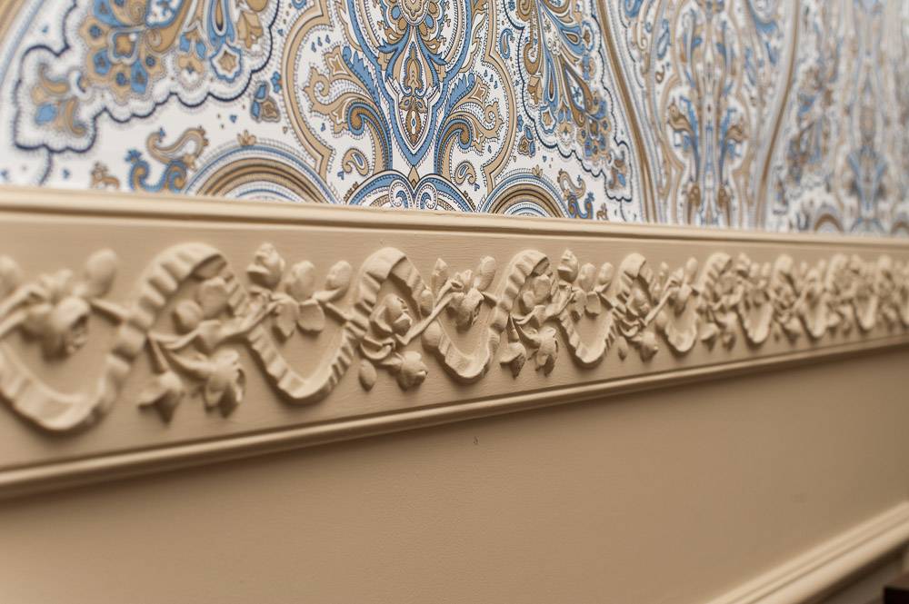 Замысловатый узор молдинга отвлечет внимание на себя. Объёмные молдинги в интерьере могут использоваться для зонирования поверхности