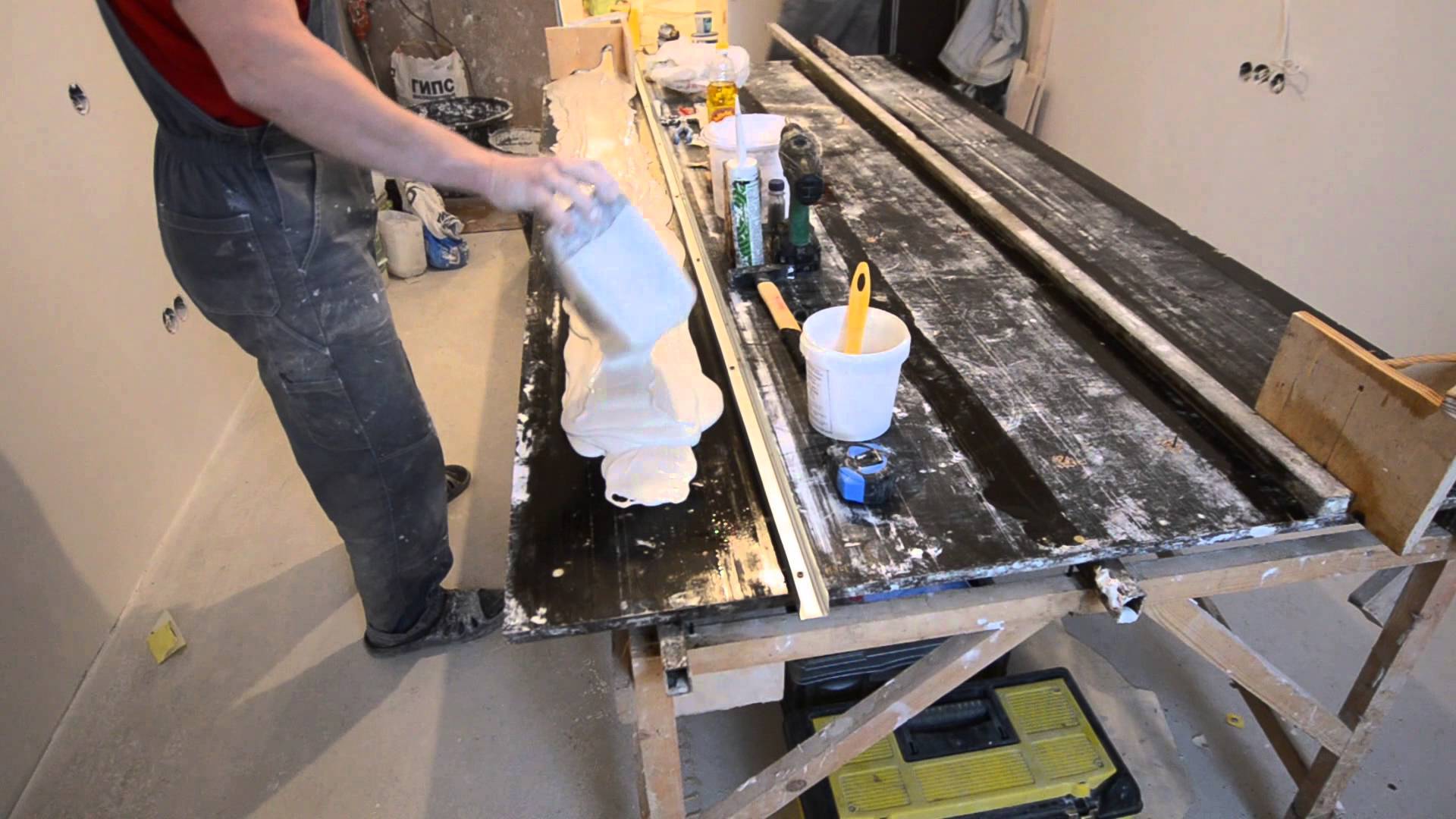 Перед тем как приступить к работе, необходимо подготовить место, а именно ровную поверхность, например, большой стол. Не стоит забывать и о защите окружающих предметов – для этого можно использовать обычную пленку, которая не допустит попадания гипса и других строительных материалов на обшивку мебели, пол и т. д.