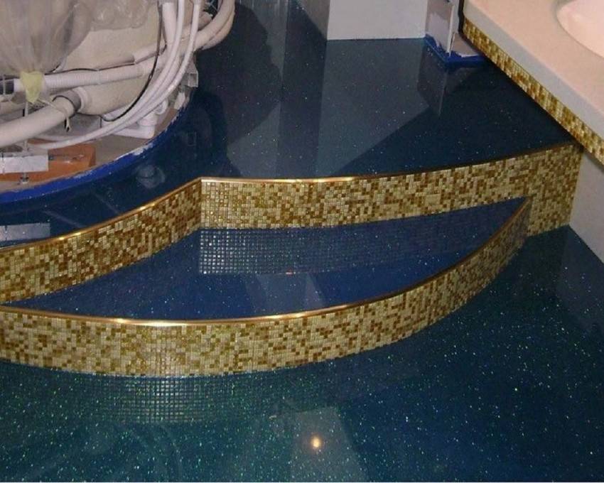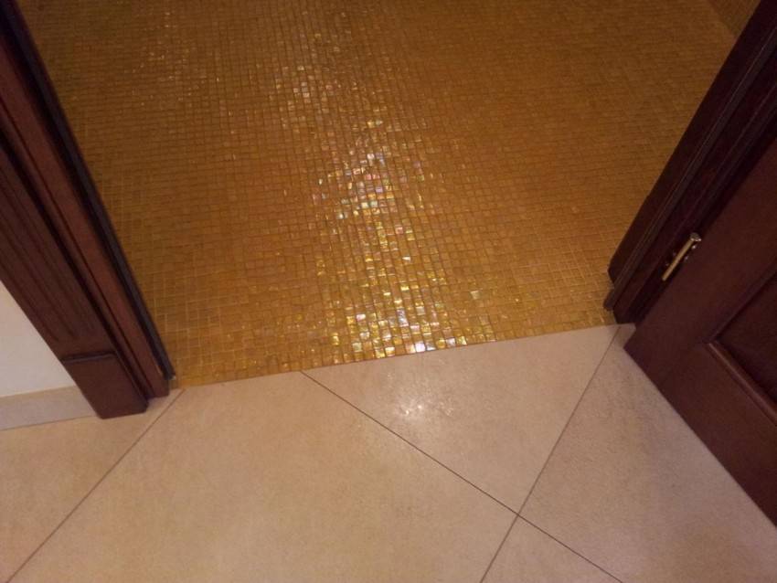 Это достаточно редкий материал, слабо представленный у нас на рынке, поэтому и цена у него соответствующая: около 7000 р. за плитку размером 50х50 см. Так как материал дорогой и очень эффектный, его редко кладут на весь пол: обычно делают полоску из такой плитки или закрывают ею небольшую площадь для игр.