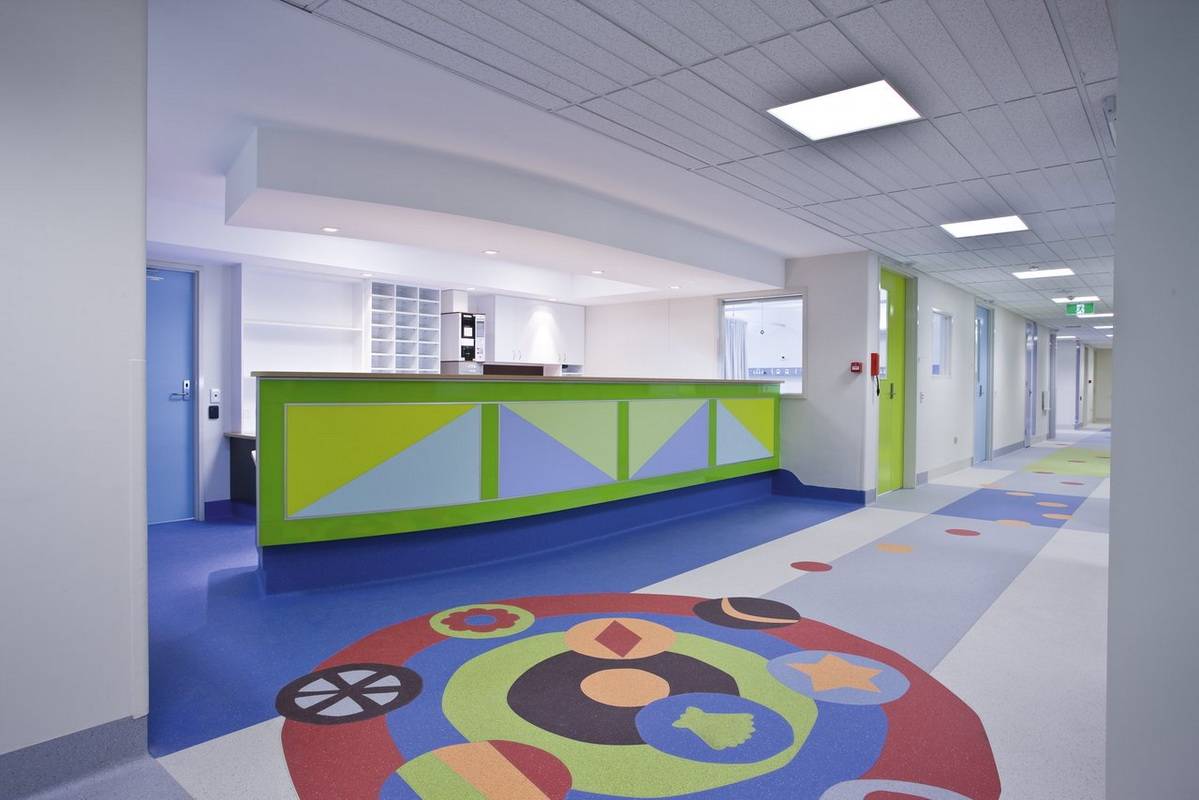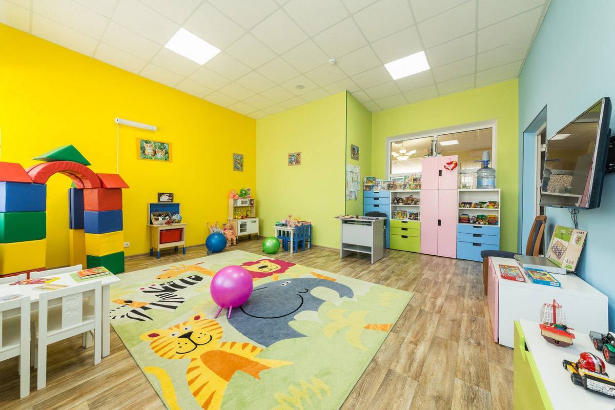 Оформление детского садика психологи рекомендуют выполнять в спокойных, приглушенных тонах, так как детская психика легко возбудима. Для этого подойдут экологичные линолеумы с функцией антискольжения (для большей безопасности детей), с рисунком под натуральное дерево или просто однотонные, например, терракотового оттенка. А вот в ванной комнате можно постелить 3D-покрытие с изображением воды и золотых рыбок.