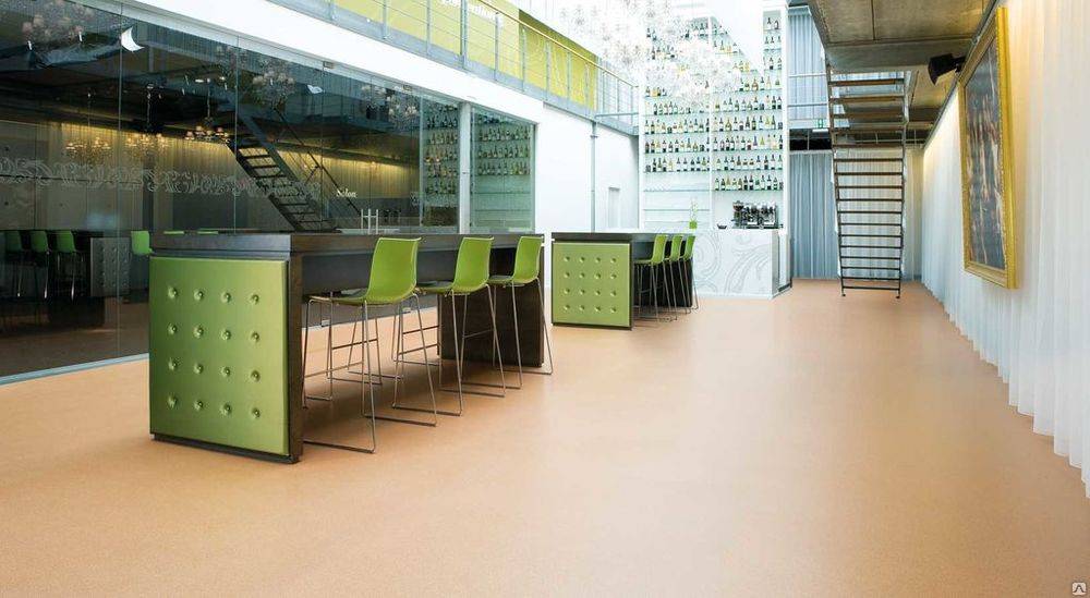 Покрытие отличается повышенной прочностью по сравнению с бытовым материалом, стоит дешевле коммерческого настила, при этом обойдется дороже домашнего линолеума.