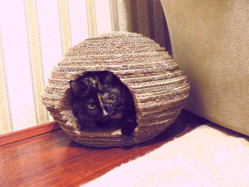 В классическом варианте когтеточка представляет собой трубу, обмотанную джутовой веревкой. Для устойчивости трубу заполняют песком, положив его в пакет из плотного полиэтилена. Лежанка с когтеточкой из коробки выполняется по следующей технологии: коробку подходящего размера заклеивают скотчем снизу, сделав отверстие для входа по двум боковым сторонам, и склеив днище коробки. Снизу загибы приклеивают термоклеем либо строительным клеем.