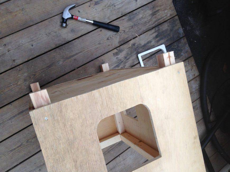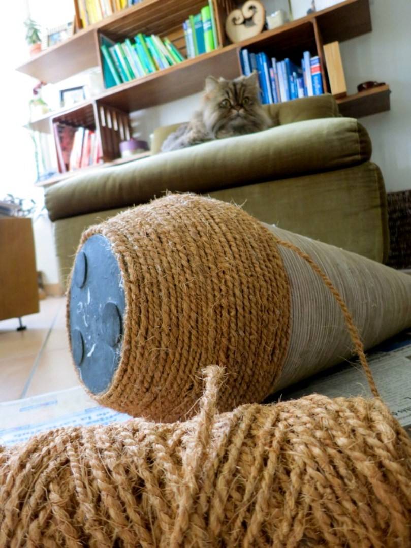 После этого изделие дополняют поролоном, а за ним и текстилем. Затем конструкцию можно приклеить на подготовленную заранее деревянную панель (например, лист ДСП) большего размера. Рядом с домиком приклеивают либо вставляют трубу в проделанное отверстие, и фиксируют клеем. Когтеточку обматывают бечевкой, стараясь делать это как можно прочнее и плотнее, чтобы кошка не смогла слишком быстро оторвать веревку.