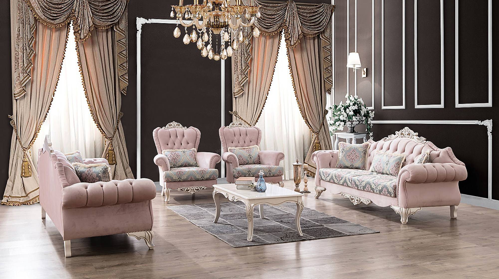 Гостиная в стиле барокко не редко составлена из двух-трех диванов и двух-четырех кресел, а также пуфиков, мягких кофейных столиков и козеток. Могут присутствовать каминные, читальные уголки с дополнительным комплектом мебели.