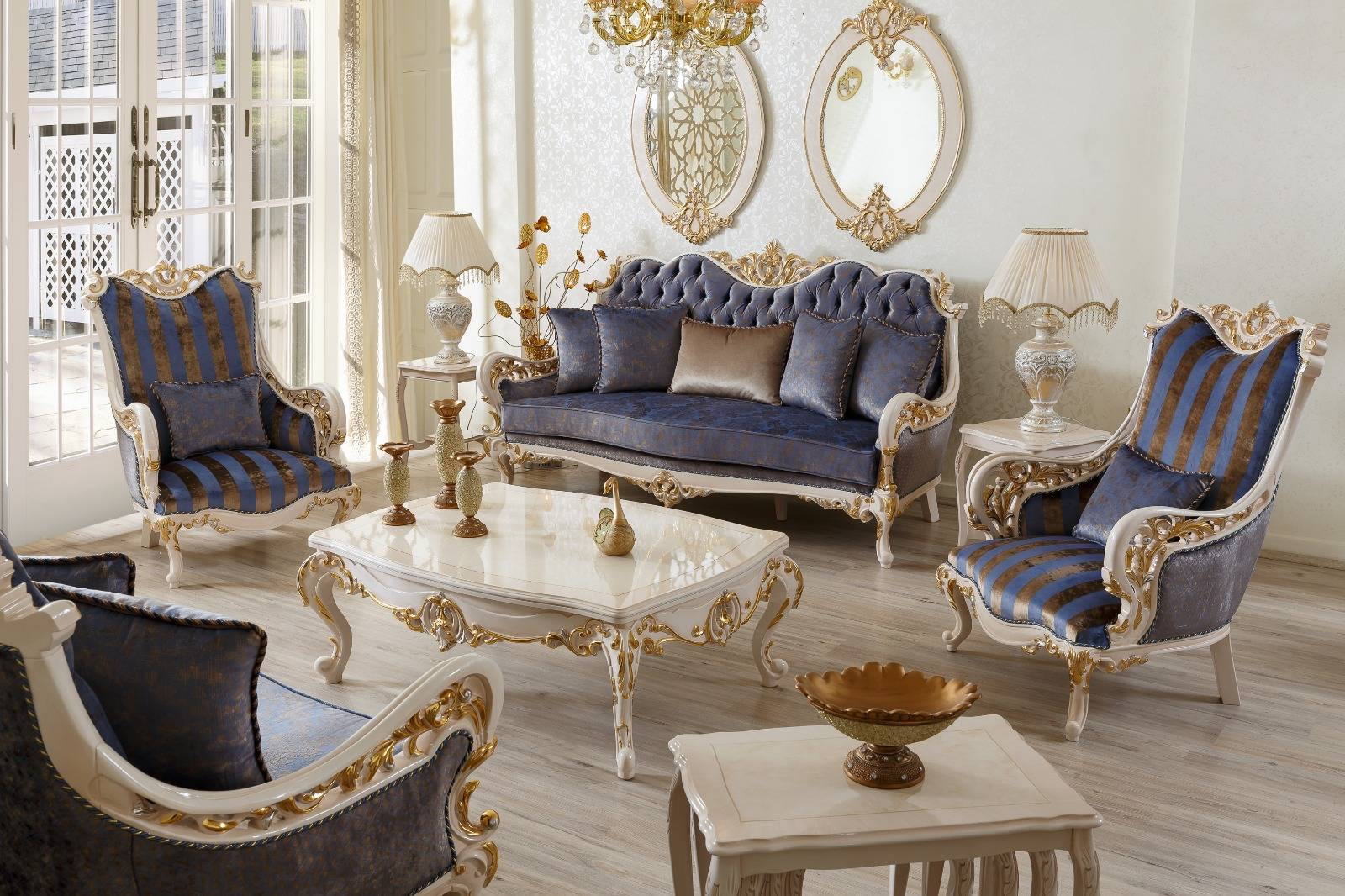 Роскошная гостиная с синими диванами в стиле барокко