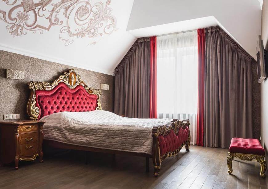 Спальня в стиле барокко чаще всего имеет большую кровать с текстильным изголовьем и стяжкой «капитоне», на деревянном каркасе и с резной рамой