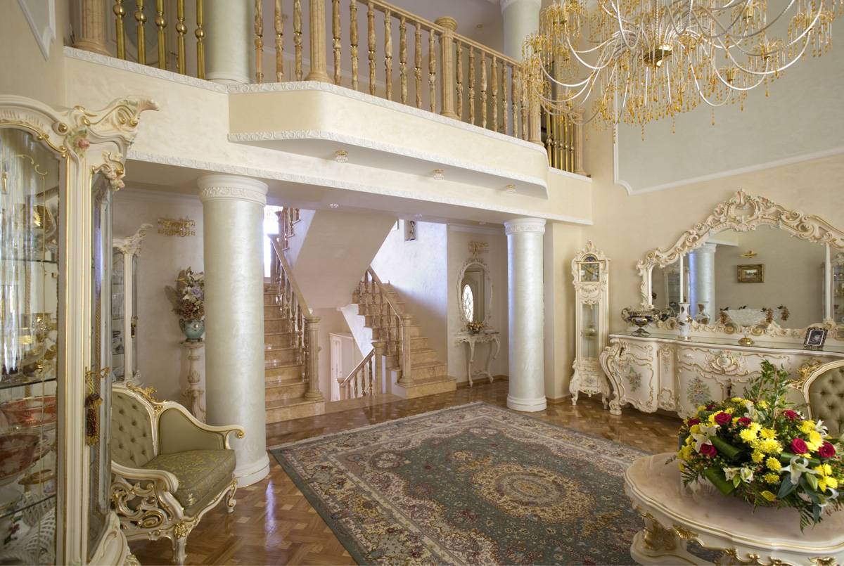 - большая люстра в центре потолка, подсвечники с канделябрами, колонны и фарфоровые скульптуры дополнят обстановку.