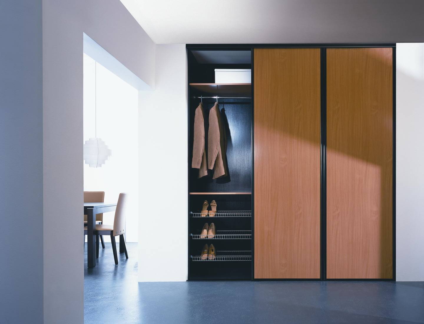 Идея приобретения П-образного шкафа выполнима, только если прихожая достаточно большая и имеет квадратную форму. В одной конструкции могут сочетаться все необходимые элементы: вешалка, обувница, полки, ящики, место для сидения. При обустройстве маленьких помещений лучше отдать предпочтение шкафу-купе, совмещенному с открытой вешалкой.