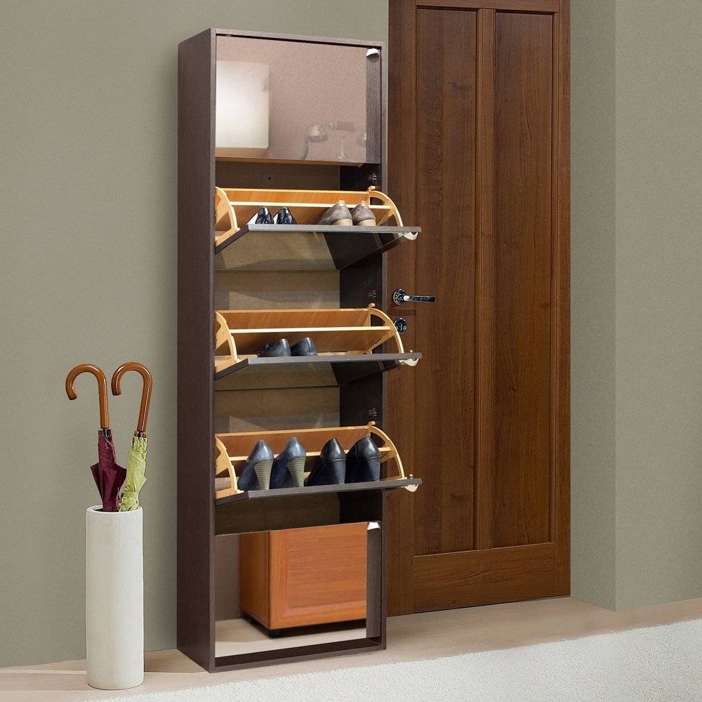 Если обустройство широкого коридора может быть любым, то с узким помещением дело обстоит сложнее. Здесь нужно использовать мебель с минимальной глубиной. Чтобы существенно сэкономить пространство, стоит приобрести обувницу-слим. В ней небольшие полки размещаются под наклоном 45 градусов, благодаря чему осуществляется компактное и удобное хранение туфель, сапог и ботинок. Если коридор достаточно широкий, выбор мебели ничем не ограничен – подойдут и стационарные шкафы разных форм, в частности, радиусные, и различные дизайнерские комоды, обувницы.