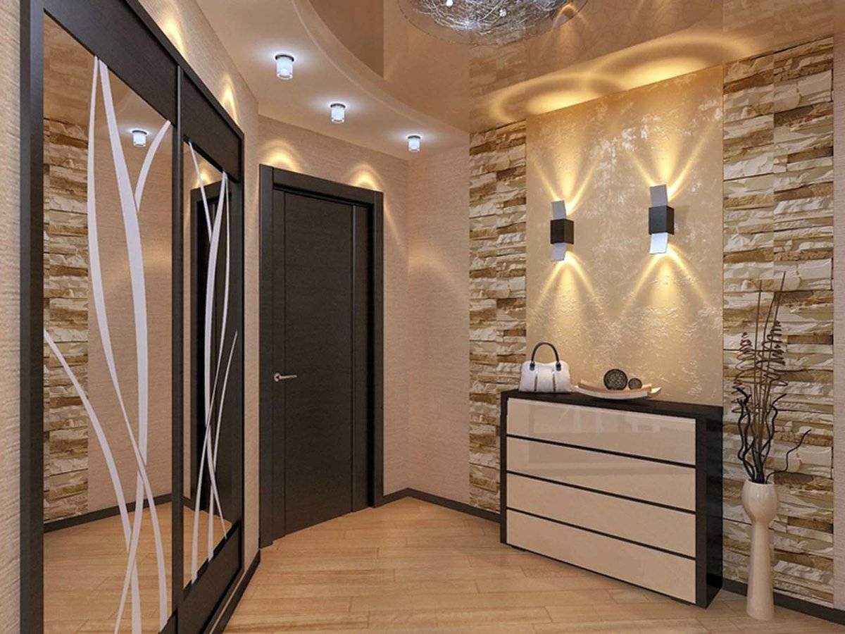 Огромную роль играет и освещение. Чаще всего прихожая, а особенно коридорного типа, представляет собой помещение без окон, то есть естественного света тут очень мало. Поэтому об осветительных приборах нужно позаботиться отдельно. Желательно не ограничиваться одним только источником света, который будет располагаться на потолке. Стоит использовать и настенные бра. Они способны сделать помещение более высоким либо низким в зависимости от того, где настенные светильники будут расположены. Если поток света направить вверх, потолок будет казаться ниже, а если вниз, то наоборот, выше. Бра дают возможность и визуально расширить коридор, если он выглядит слишком узким. Для этого нужно направить лучи света от одной стены на другую.
