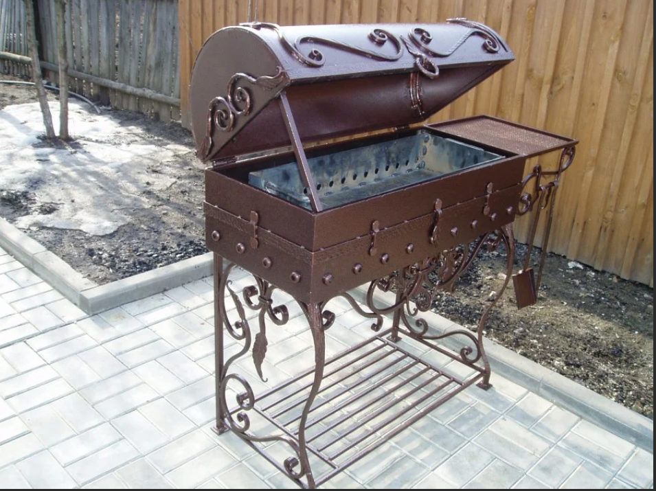 Чтобы избежать полного распахивания крышки, можно приварить металлический прут или цепь. Благодаря этому данный элемент ограничивается в движении. Разрешается окрасить барбекю, но лучше делать это снаружи. Внутренняя часть все равно остается скрытой от глаз. Используют краски, устойчивые к воздействию высоких температур. Они должны выдерживать до 800?С. Краску рекомендуется наносить только после того, как поверхность будет покрыта специальной грунтовкой.