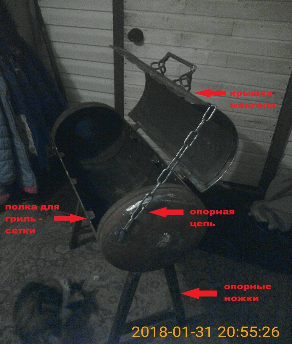 Ножки мангала можно изготовить самостоятельно различными способами, также представляется возможность использовать готовую подставку от старой швейной машины. Процесс жарки в ускоренном режиме подразумевает закрытую крышку, для отвода дыма необходимо смонтировать трубу. Барбекю из баллона изготавливается путем добавления к конструкции уголков во внутренней части, для крепления сетки или металлических прутков.