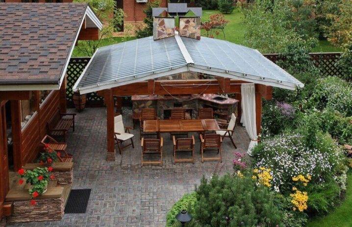 Чаще всего зона барбекю включает в себя не только печь, но и другие атрибуты. Для этой зоны рекомендуется обустроить специальную площадку с навесом или беседку. Здесь же установить мебель для комфортного пребывания на воздухе.