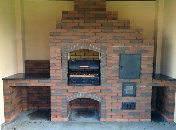 Кирпичные печи имеют разную форму и габариты. Они могут монтироваться под крышей или не иметь ее. Различаются модели по форме жаровни – треугольные, круглые, квадратные, многоугольные. Такое разнообразие позволяет подобрать конструкцию, наиболее подходящую под выбранный участок установки.