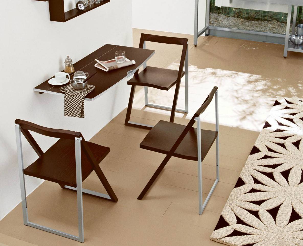 Для обитателей квартиры, чаще обедающих вне дома, подойдут откидные столы для маленькой кухни. Раскладываемая в нужной ситуации мебель, в обычное время становится частью стены. А при трансформации обеспечивает 2–3 места.