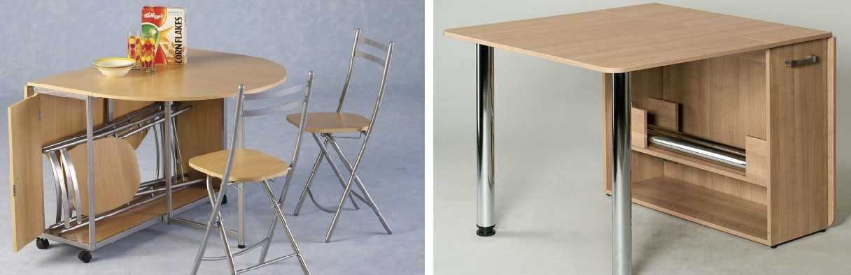 Есть столы-трансформеры для кухни. В некоторых используется тот же принцип, что и в известных столах-книжках. К основной рабочей поверхности добавляется некоторый «кусок», тем или иным образом закрепленный на основной столешнице.