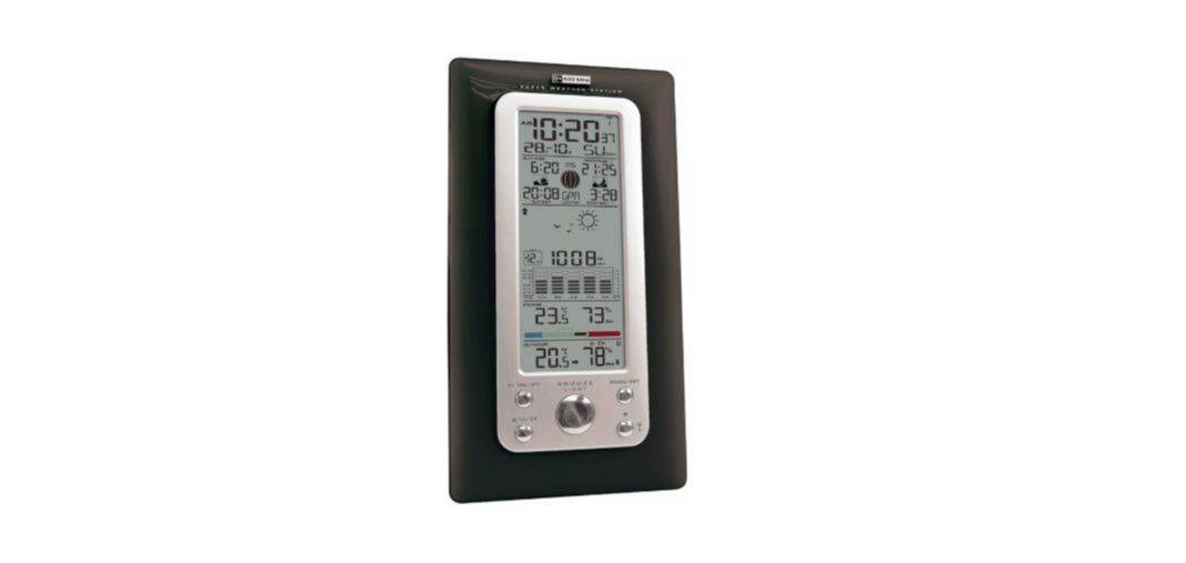 В этой категории на первом месте домашняя метеостанция с крупным экраном, на котором видны показания под любым углом. Прибор способен определять влажность воздуха, температуру и сообщает время. Многие приобретают эту метеостанцию в дополнение к увлажнителю воздуха без гигрометра.