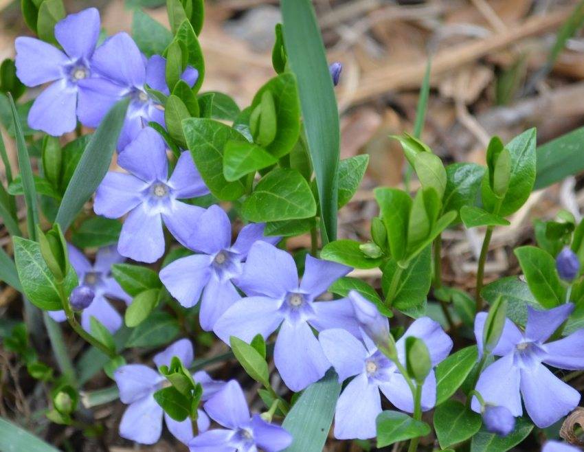 Побеги барвинка стелются по земле и разрастаются вширь.