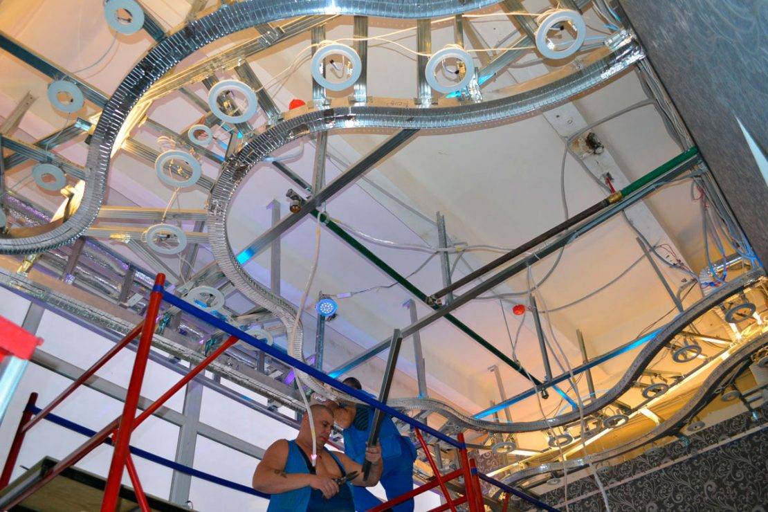 После сборки каркаса приступаем к прокладке электрических кабелей для монтажа светодиодной подсветки. Для защиты кабелей от повреждения и короткого замыкания используем гофрированные рукава. Каналы прокладываем и фиксируем на базовой поверхности специальными крепежами.