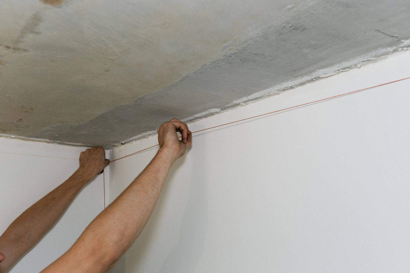 В ожидании материалов можно заняться черновым потолком. С него убирают остатки прежней отделки: краски, штукатурки, обоев или плитки. Для этого пользуются шпателем и водой, иногда с добавлением специальных средств. Если не убрать старое покрытие, оно может упасть на плёнку после установки. Тогда потолок некрасиво провиснет под тяжестью, а если углы острые, то и порвётся. Легче предупредить подобные проблемы, чем позже ремонтировать или полностью менять полотно.