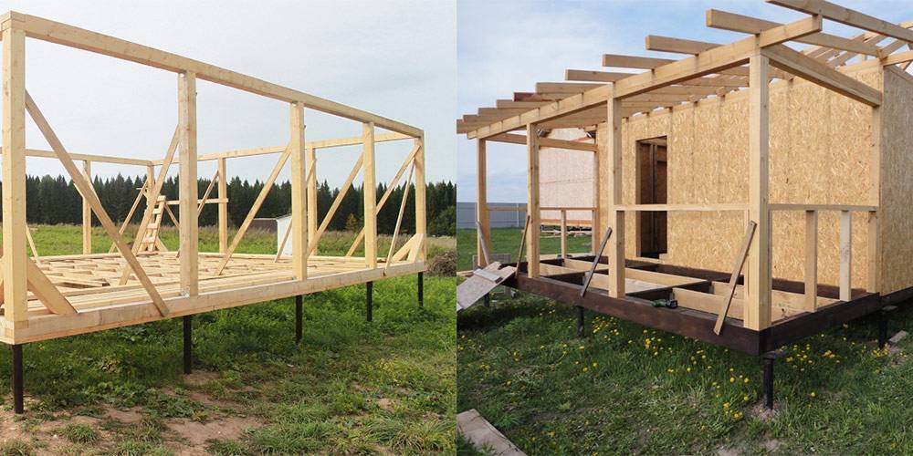 Каркасные домики подойдут для подвижных грунтов, илистых участков. Они не дают усадки, поэтому к отделке можно приступить сразу после возведения коробки.
