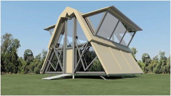 Интересное техническое решение – самораскладывающиеся мобильные дома, которые выпускает компания «Ten Fold Engineering». В собранном состоянии он помещается в стандартный контейнер и перевозится к месту установки на грузовике. После выгрузки на месте установки достаточно нажать кнопку, чтобы конструкция развернулась в полноценное здание площадью 60 кв. м.