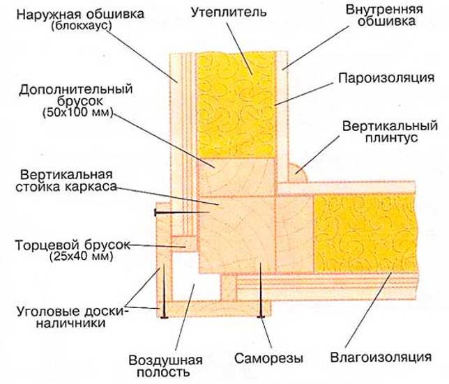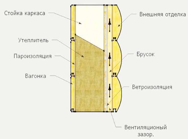 Для внутренней обивки применяют деревянную вагонку или гипсокартон, снаружи обделывают блок-хаусом, сайдингом или другими материалами. Между основной стеной и навесным фасадом для дополнительного утепления также может использоваться теплоизоляционный материал.