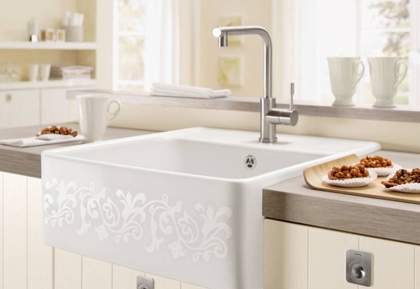 Керамика смотрится элегантно, подходит для кухни кантри или в духе ретро. Она покрыта эмалью: это возможность сделать модели разных цветов и даже с рисунками. Эмаль не подвергается окислению, ее невозможно поцарапать. Один из дорогих разновидностей кухонных моек, монтировать ее может только профи.