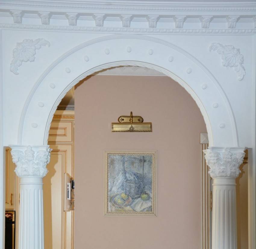 Классический стиль всегда предполагает арочные конструкции, что потребует или фигурных, или гибких молдингов
