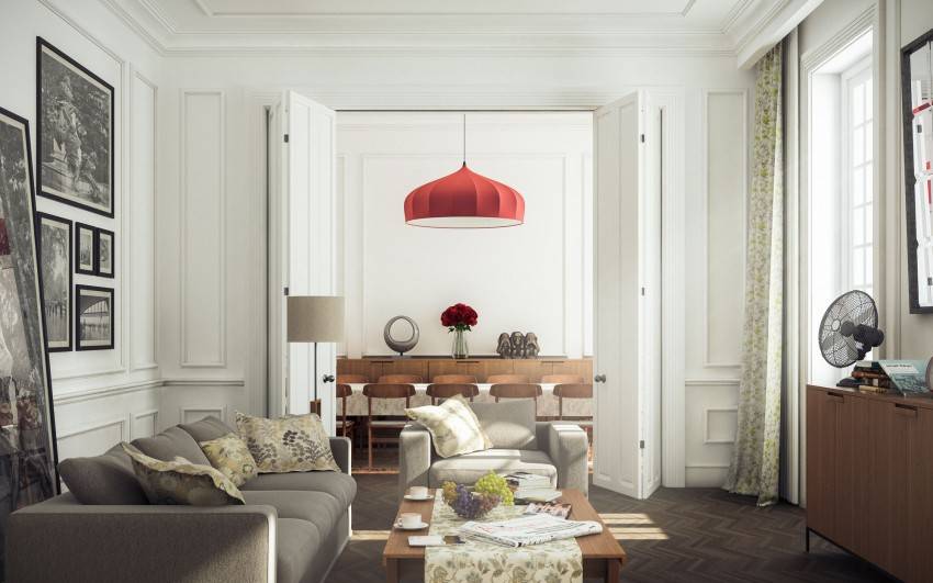 - Линии из молдингов делят комнату оптически, послужат способом спрятать края обоев на стыке стен дверей или окон.