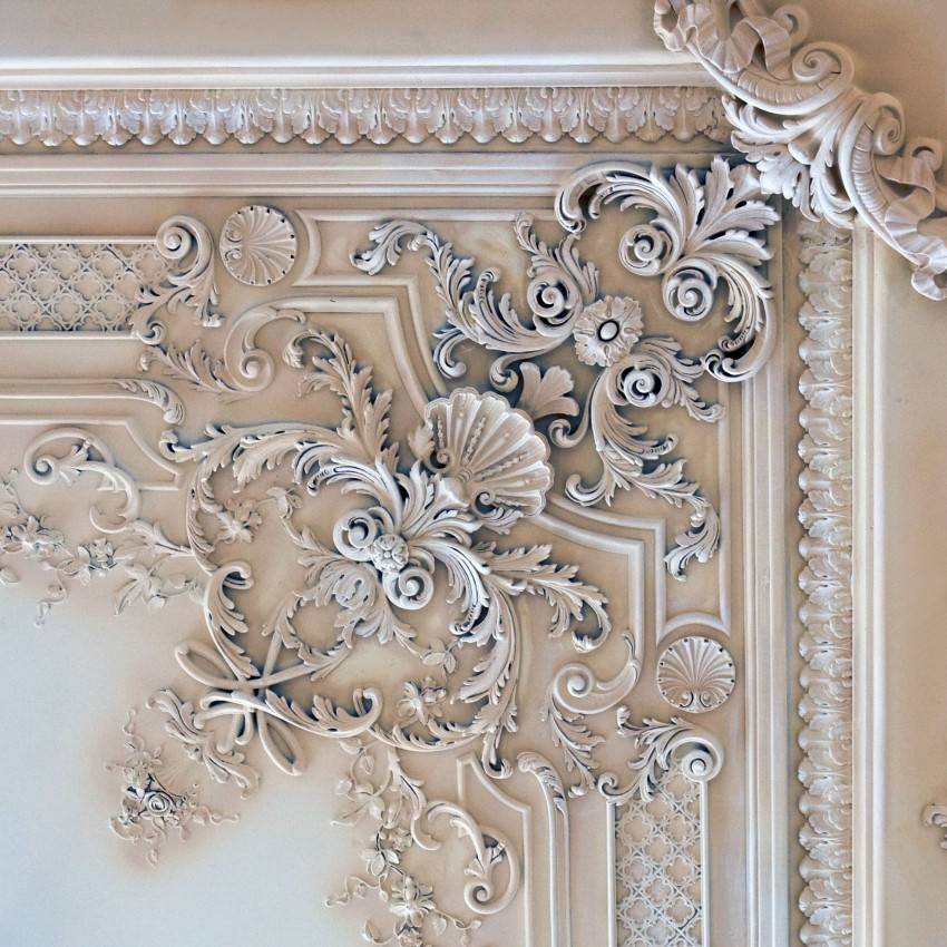 Обычно его применяют для оформления потолков, стыков стен и потолка, углов. Он долговечен, но слишком тяжел, поэтому работать с ним непрофессионалу будет очень непросто. Крепится к поверхности с помощью алебастра. Гипсовый декор можно окрашивать в разные цвета.