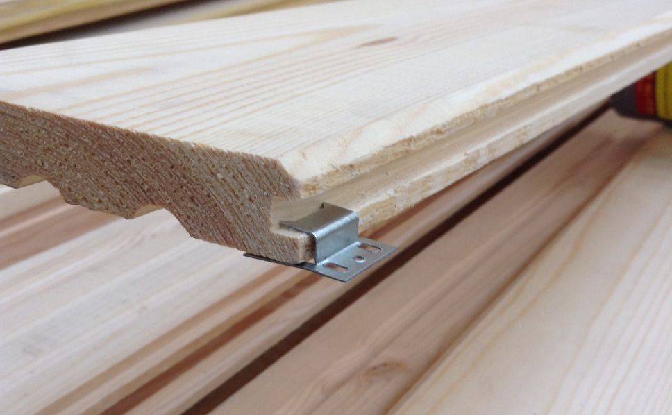 Первые панели на углу между потолком и стеной, а также последние между стеной и полом лучше закрепить «через тело» и закрыть их плинтусами. Крепёж последующих элементов конструкции осуществляется кляймерами «через паз» или саморезами с гвоздями «через шип».