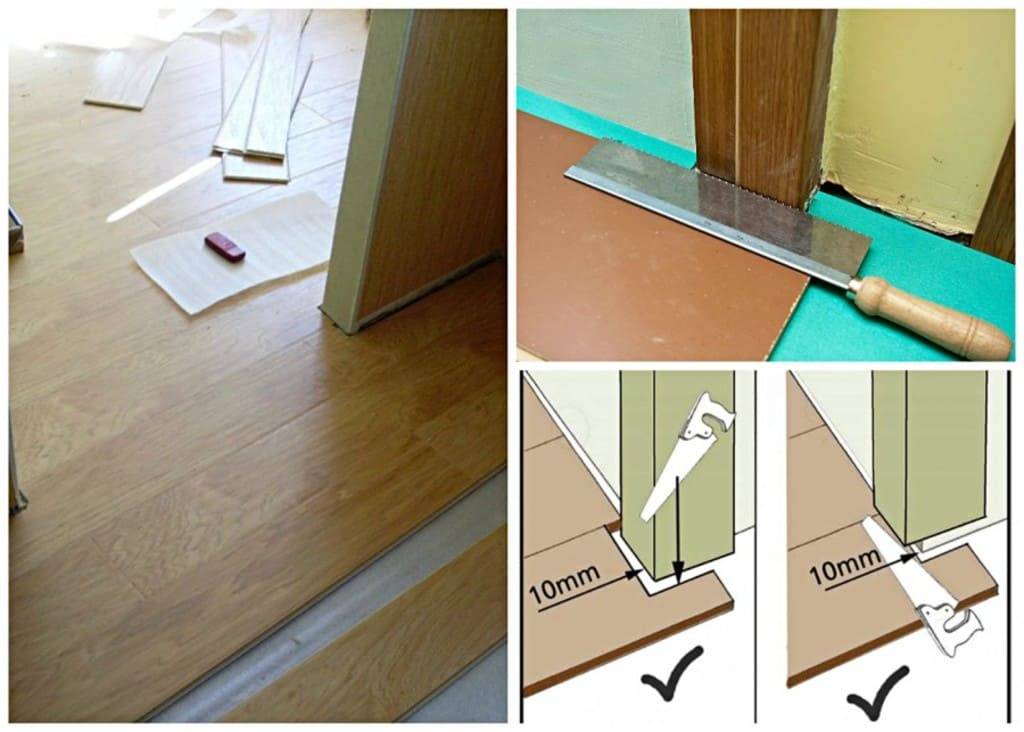 В этом отношении больше проблем возникает с дверными проемами, особенно если уже установлены коробки – мало того, что их придется подрезать на толщину ламината и подложки вместе взятых, так еще придется и повозиться с тем, чтобы закрыть замки. Это, можно сказать, невозможная операция, так что сначала необходимо делать пол, а потом монтировать двери.