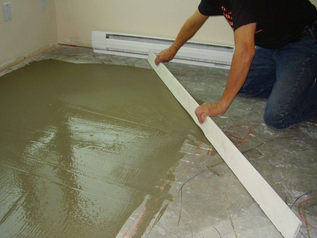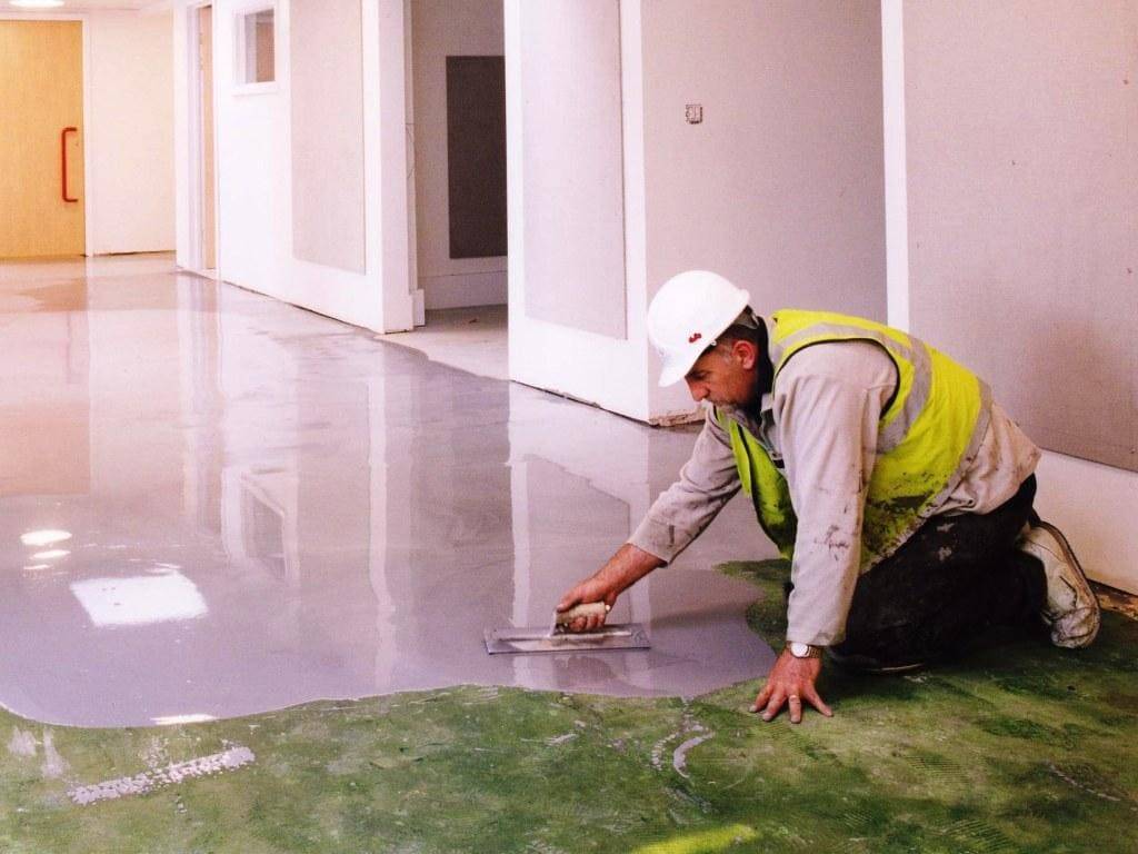 Но, так как такая смесь дорогая, в основном для выравнивания бетонного пола используют раствор песка и цемента. Сам процесс заливки данной стяжки ничем не отличается от технологии со смесью, но только для соблюдения одного уровня по всему периметру устанавливаются маячки.