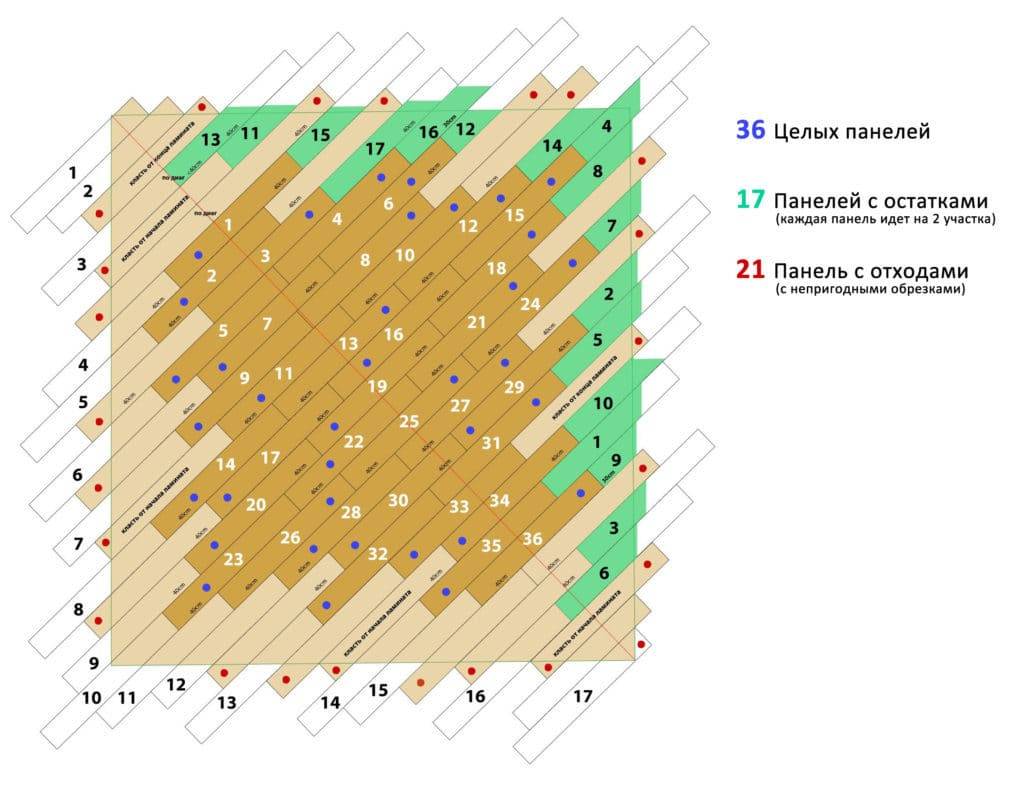 В общем принцип укладки практически не будет отличаться от такового при прямом монтаже – с той только разницей, что обрезки будут треугольными, а изначально количество материала должно быть подготовлено больше. Так, количество рассчитывается из площади комнаты, однако необходимо будет добавить примерно 15 процентов количества материала на дополнительные отходы. Для особо опытных укладчиков это число можно сократить до 5 процентов, средние значения будут примерно около 10 процентов.