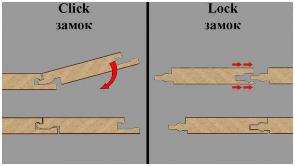 - Click-замки с двойной фиксацией. В этом случае последующие панели не только всовываются в паз предыдущего элемента, но и защелкиваются, если применить небольшое усилие. Подобное крепление считается более качественным и не нуждается в дополнительной фиксации с помощью того же клея или молотка.