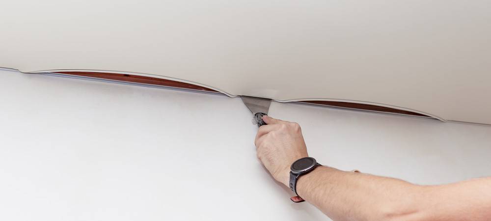 - Клиновая. Эта технология предусматривает установку крепежного металлического профиля на расстоянии около 2-3 сантиметров от основной поверхности. После этого натяжное полотно нагревается и зажимается в профиле при помощи специализированных клиньев. Далее полотно натягивают и обрезают излишки ПВХ. Клиновый способ является более надежным, чем шпатиковый.