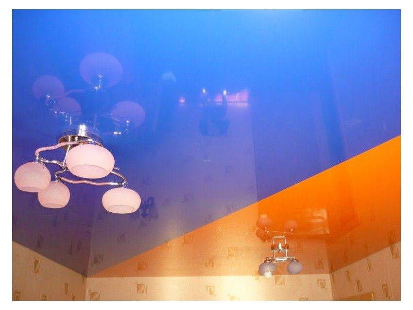 Также на полотне одноуровневого потолка может быть два цвета. Такое сочетание достигается путём сваривания двух полотен на станках ТВЧ. Подвесные потолки с одним уровнем, как правило, монтируются при дефиците высоты помещения и глубина потолочной пазухи не превышает 4-5см (см. Одноуровневый потолок из гипсокартона своими руками: инструкция по монтажу).