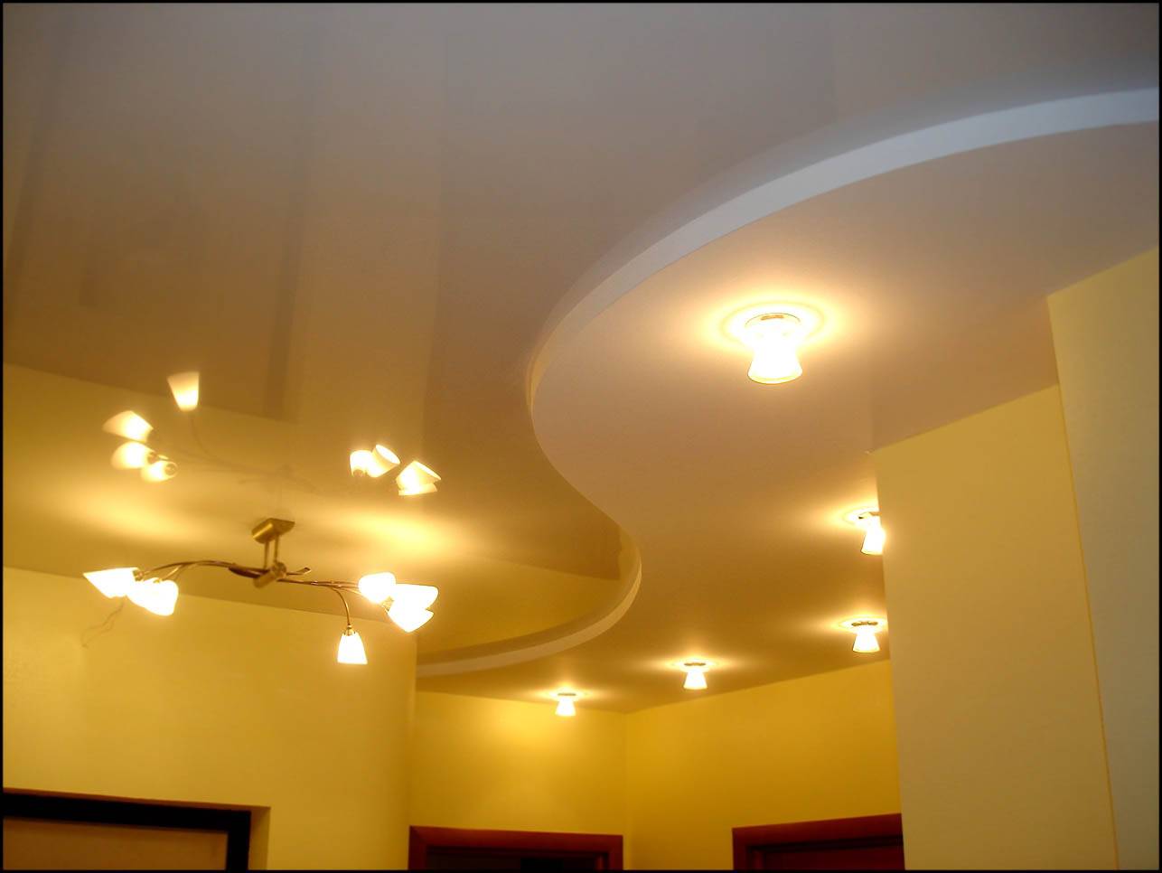 При устройстве многоярусной конструкции важно правильно рассчитать местоположение нижних уровней, чтобы их форма не создавала диссонанса во внешней структуре потолка в целом. При выборе конструкции с плавными изгибами понадобится установка фигурного каркаса и изгибание листов гипсокартона
