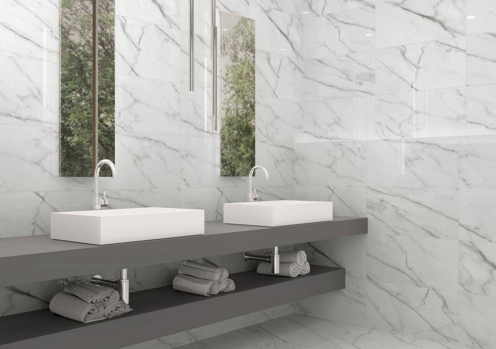 Важно соблюдать гармонию напольных и настенных покрытий. Избегайте плитки с полированной отделкой, из-за высокого риска повреждений