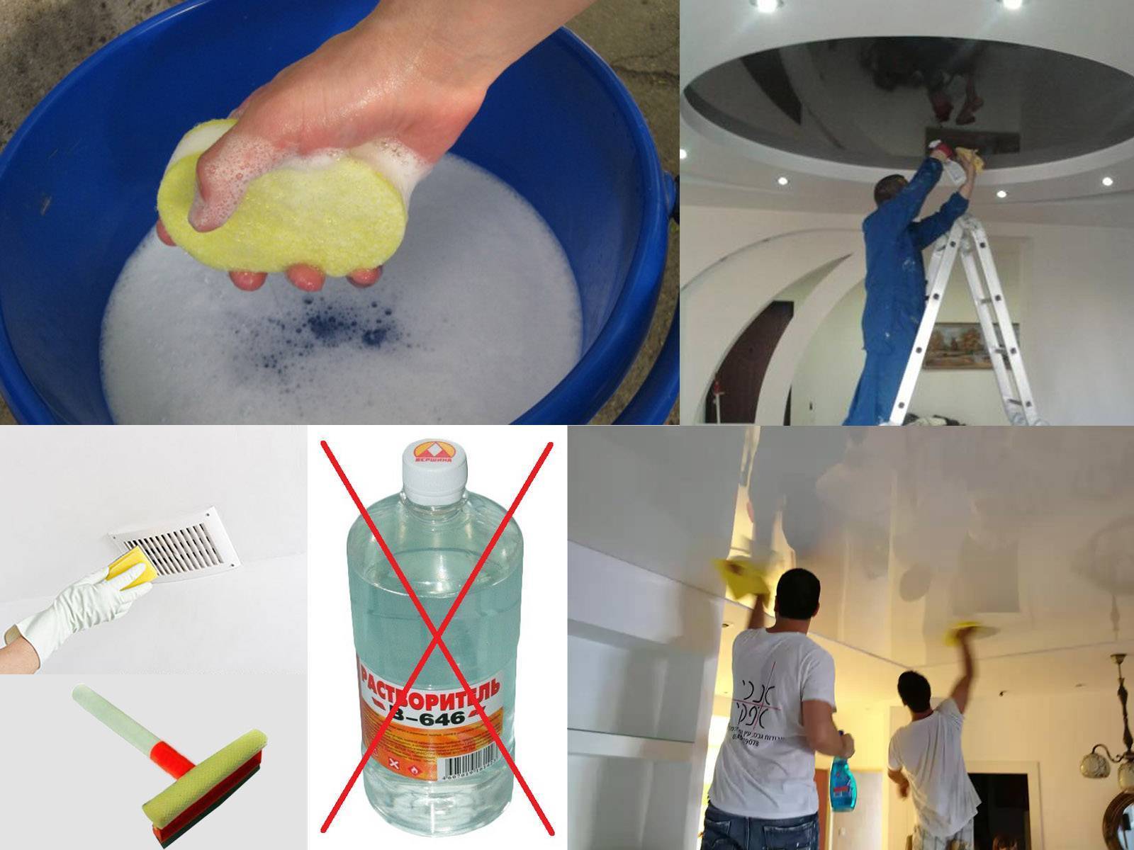 Профессиональные средства по уходу за натяжными потолками предлагают производители этих отделочных материалов. Использование таких составов позволяет очистить поверхность от всех видов загрязнений быстро и легко. После мытья не остается разводов, поэтому уборку можно провести в один этап.