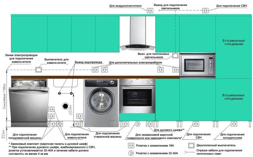 А также выделяют ряд советов по расположению точек подключения к электросети для различных кухонных приборов и бытовой техники: